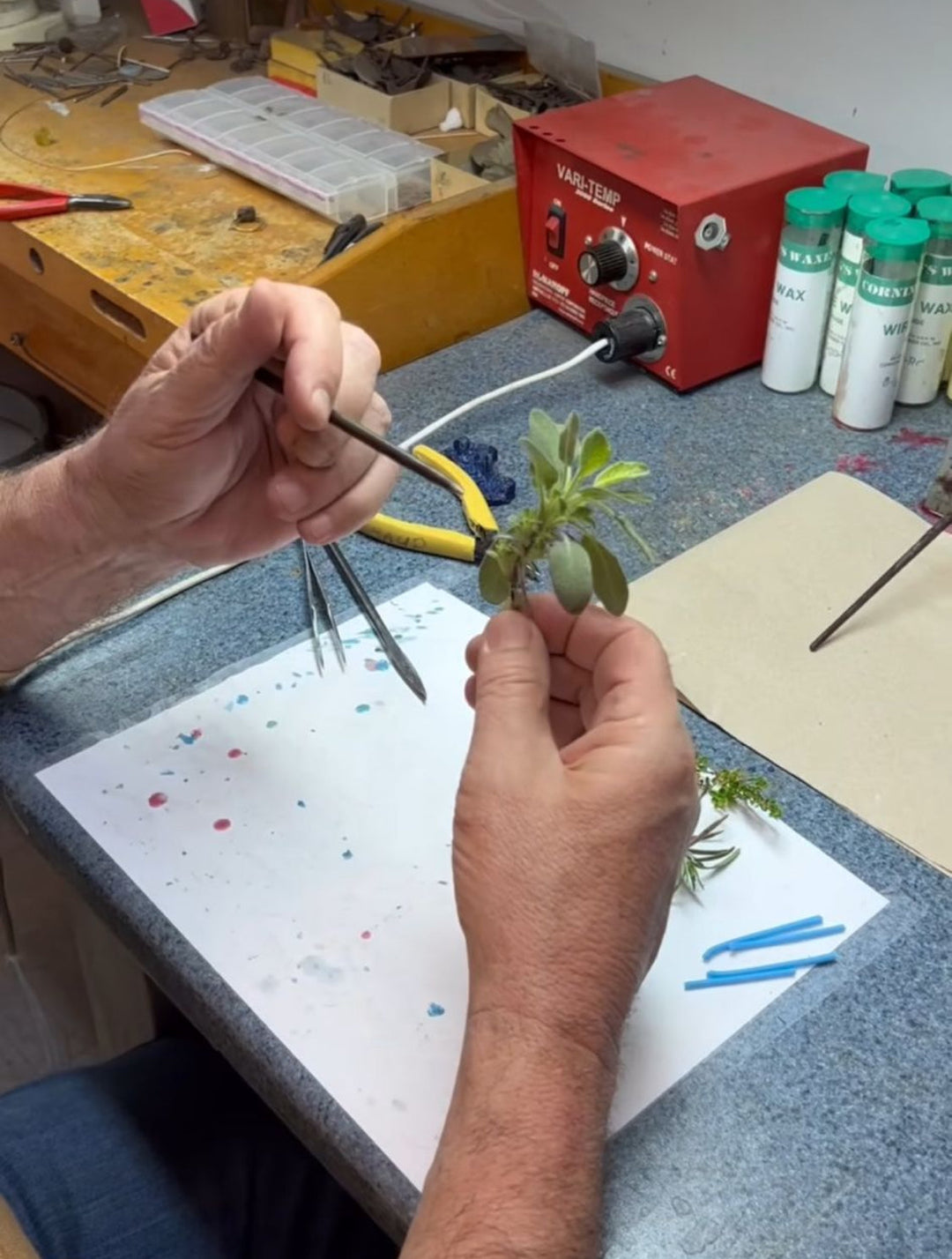 Our unique jewelry is made by creating molds directly from botanical elements in a process similar to lost-wax casting. While traditional lost-wax casting begins with a hand-carved model of wax, Michael Michaud uses an actual leaf, branch or flower in place of the wax model. A mold is created around the botanical element and as it is heated the plant matter burns away and leaves behind a beautifully detailed mold of itself.